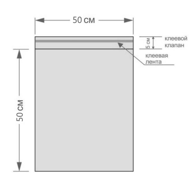 Пакеты ПВД размером 50*50 см с клеевым клапаном 5 см изготовлены из первичного полиэтилена высокого давления (ПВД) плотностью 75 мкм.
